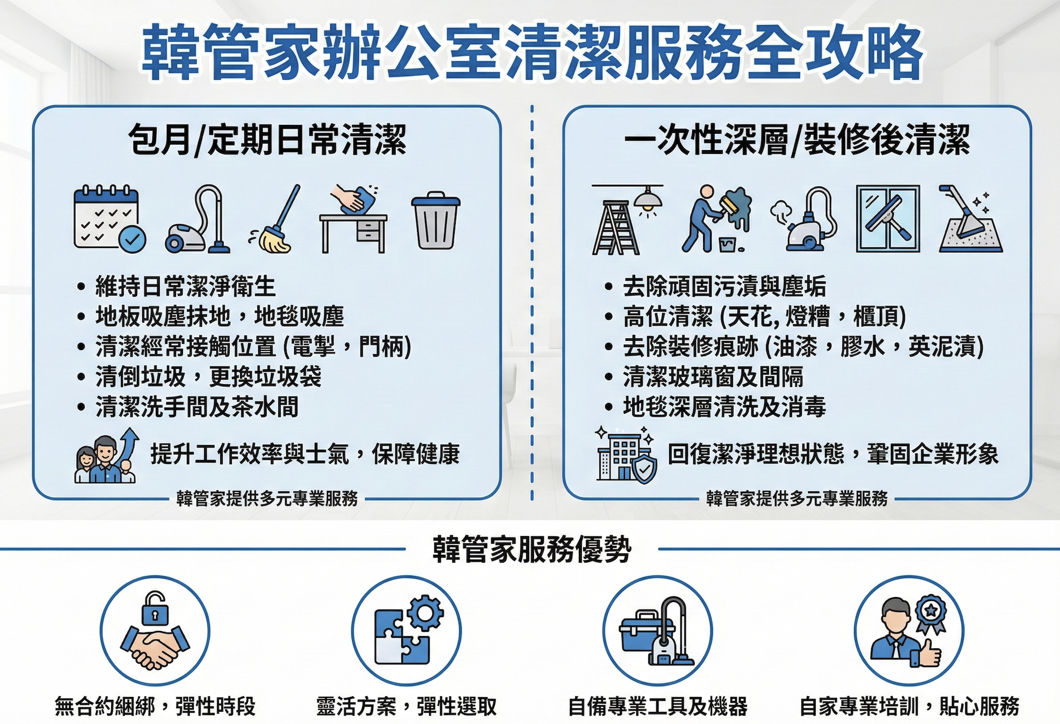 除了包月清潔服務外,韓管家也為寫字樓提供一次性的深層清潔服務。辦公室、店鋪、中心場所、遊玩設施等經過長時間使用容易積聚頑固污漬、塵垢,如只靠日常基本打掃不能高效地去除污漬。